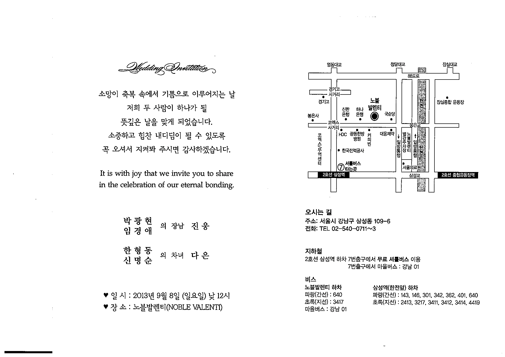 * 장소 : 노블 발렌티 02-540-0711(강남구 삼성동 109-6. 삼성역 7번 출구. 셔틀버스 운행)