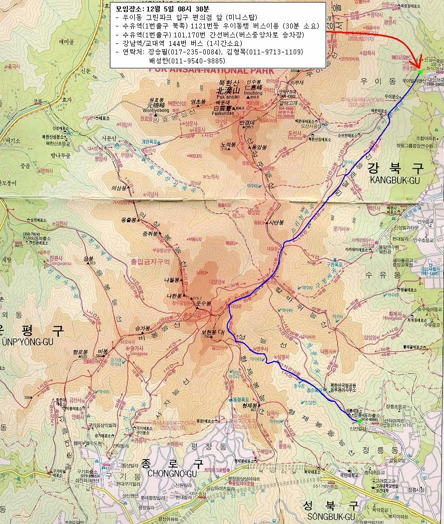 | 한국건설산악회 12월 산행지로 북한산(진달래능선-대성문-대성능선-정릉매표소)을 갈려고 합니다. 북한산에서 많은 회원님들과 함께 만추의 여유와 새로운 계절을 미리 만나보는 자리가 될 수 있도록 많은 참석바랍니다. 한국건설산악회 정기총회 일정에 대해서도 간단히 이야기를 나눌 예정이므로 많은 참석바랍니다. 1. 일시: 2004년 12월 5일 일요일 08시 30분 2. 모임장소: 우이동 그린파크 들어가는 교량 앞 편의점(미니스탑) * 수유역(1번출구)에서 1121번등 우이동행 버스 이용종점하차. (30분정도 소요) * 강남역 또는 교대역에서 144번 지선버스를 타시면 한시간정도에 오실수 있습니다. 3. 등산코스: 집결지-우이분소 매표소-진달래능선-대동문-보국문-대성문-대성능선갈림길-영추사-정릉매표소 4. 예상산행시간: 4시간 (간식시간 포함) 5. 산행준비물: 간단한 행동식(과일, 떡, 초콜렛 등), 식수, 따뜻한 옷 6. 점심 식사는 하산 후 하도록 하겠습니다. 7. 산행코스지도를 참조하세요. ![]() |