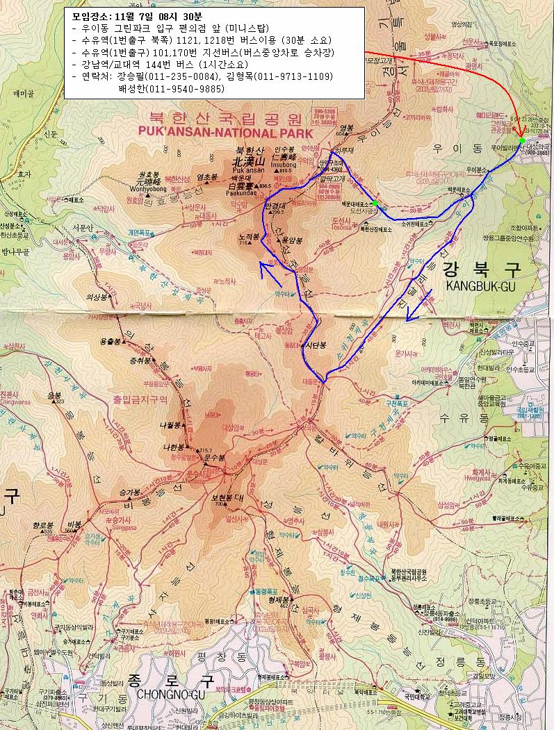 | 한건산 11월 산행지로 북한산(진달래능선-만경대-하루재-백운대매표소)을 갈려고 합니다. 북한산에서 많은 님들과 함께 만추의 여유를 느낄수 있는 자리가 될 수 있도록 많은 참석바랍니다. 1. 일시: 2004년 11월 7일 일요일 08시 30분 2. 모임장소: 우이동 그린파크 들어가는 교량 앞 편의점(미니스탑) * 수유역(1번출구)에서 1121, 1218번 지선버스 또는 101, 170번 간선버스 이용 종점하차. (30분정도 소요) * 강남역 또는 교대역에서 144번 지선버스를 타시면 한시간정도에 오실수 있습니다. 3. 등산코스: 집결지-우이분소 매표소-진달래능선-대동문-북한산성-만경대-깔딱고개-하루재-백운대 매표소 4. 예상산행시간: 4시간 (간식시간 포함) 5. 산행준비물: 간단한 행동식(과일, 떡, 초콜렛 등), 식수 6. 점심 식사는 하산 후 하도록 하겠습니다. 7. 산행코스지도를 참조하세요. ![]() |