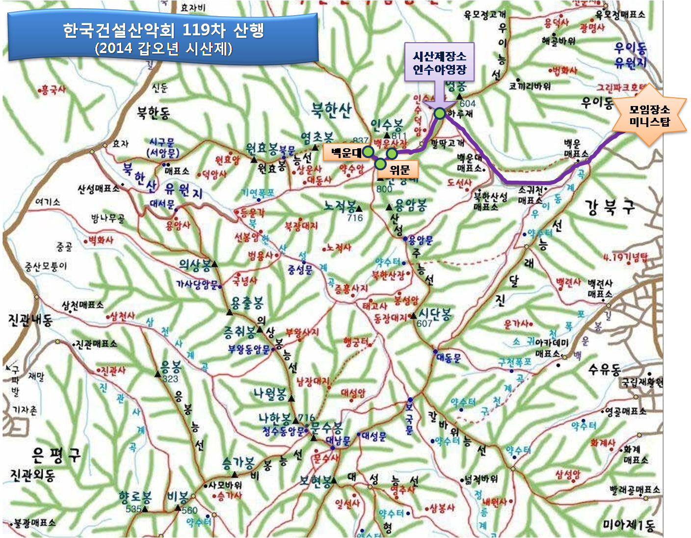 | 한건산 회원 여러분! 봄 기운이 물씬 느껴지는 따스한 계절에 한건산 119차 정기산행 및 우리 모두의 안녕과 건강을 기원하는 『한건산 2014 갑오년 시산제』를 아래와 같이 진행하오니 회원 여러분의 많은 참석 부탁드립니다. -- 아 래 -- ▶ 일시 : 2014년 3월 1일 토요일 08:30 ▶ 모임장소 : 우이동 미니스탑 편의점 ▶ 시산제장소 및 시간 : 인수야영장 (2013년 시산제장소와 동일) 12:00 ▶ 회비 : 2만원 ▶ 시산제일정 1) 산행코스 미니스탑 → 하루재 → 백운산장 → 위문 → 백운대 → 위문 → 인수야영장(시산제장소) 2) 산행은 개인의 역량에 맞추어 하시고, 11시 50분까지는 시산제 장소로 모여주십시오. 3) 시산제에 필요한 물품은 집행부에서 준비하겠습니다. 4) 다만, 회원님께서 협조해 주셔야 할 일은 들머리인 우이동 미니스탑에서 각자가 시산제용 막걸리 한 통 씩만 시산제 장소로 가져다 주시면 됩니다. 5) 산행 시 필요한 주류는 각자의 주량에 맞게 준비하시면 됩니다. 6) 뒷풀이 장소는 추후 공지하겠습니다. [산행코스] ![]() |
