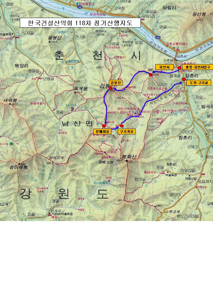 | 1. 일시: 2014년 2월 8일 토요일 오전 8시 30분 (시간변경안내 8:00am --> 8:30am 으로 변경되었습니다) *참고로 상봉역 춘천행 출발시간은 8:14, 8:37, 9:00 이며 강촌역까지 소요시간은 70분입니다. *시간이 변경 되었습니다. 다시 한 번 숙지 바라며, 또한 양해 구합니다. 2. 모임장소:상봉역 경춘선 플랫폼 3. 등산코스 산행길 : 강선사입구 - 강선사 - 강선봉 - 검봉산 - 문배마을 - 구곡폭포 - 구곡교 4. 산행거리 및 산행시간 : 약 7Km / 4시간 정도 (중식 포함) 5. 산행준비물: 등산복, 등산화(릿지화), 장갑, 스틱, 아이젠 등 산행장비, 행동식(과일, 떡, 초콜렛 등), 식수 6. 점심 식사 장소: 당일 결정토록하겠습니다. ![]() |