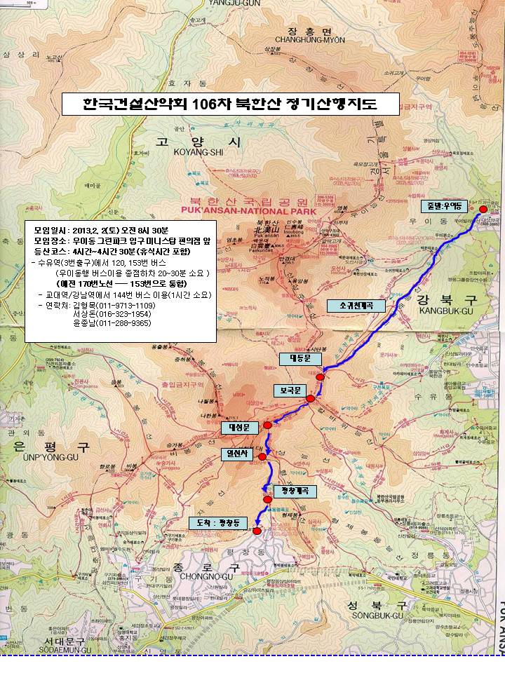 | 1. 일시: 2013년 2월 2일 토요일 오전 08시 30분 2. 모임장소: 우이동 그린파크 들어가는 교량 앞 편의점(미니스탑) * 수유역(3번출구)에서 120, 153번 등 우이동행 버스 이용종점하차. (20~30분정도 소요) * 예전 170번 노선이 4월부터 153번 노선으로 통합되었습니다. * 강남역 또는 교대역에서 144번 지선버스를 타시면 한시간정도에 오실수 있습니다. 3. 등산코스 우이동 - 소귀천계곡 - 대동문 - 보국문 - 대성문 - 일선사 - 평창계곡 - 평창지킴터 - 평창동 4. 예상산행시간 : 4시간 ~ 4시간 30분 (휴식시간 포함) 5. 산행준비물: 등산복, 등산화(릿지화), 장갑, 스틱 등 산행장비, 행동식(과일, 떡, 초콜렛 등), 식수 * 필요시 아이젠 지참 6. 점심 식사 장소: 당일 결정토록하겠습니다. 7. 문의 및 연락처 김형목(011-9713-1109) 서상돈(016-323-1954) 윤종남(011-288-9365) ![]() |