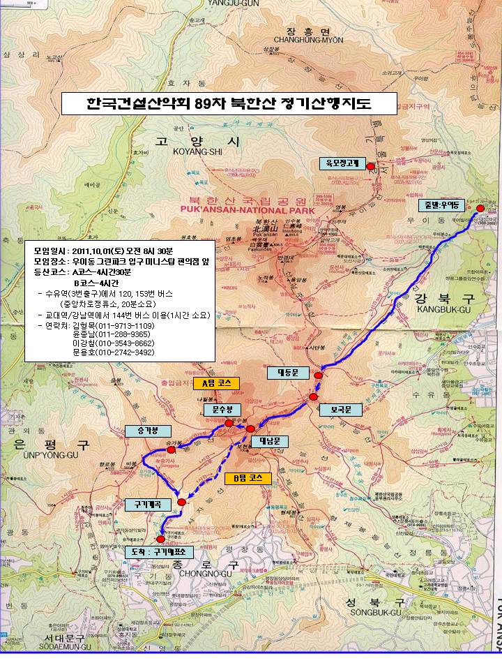 | 1. 일시: 2011년10월 1일 토요일 오전 08시 30분 2. 모임장소: 우이동 그린파크 들어가는 교량 앞 편의점(미니스탑) * 수유역(3번출구)에서 120, 153번 등 우이동행 버스 이용종점하차. (20~30분정도 소요) * 예전 170번 노선이 4월부터 153번 노선으로 통합되었습니다. * 강남역 또는 교대역에서 144번 지선버스를 타시면 한시간정도에 오실수 있습니다. 3. 등산코스 A 코스 : 우이동 - 진달래능선 - 대동문 - 보국문 - 대남문 - 문수봉 - 승가봉 - 사모바위 - 승가사 - 구기계곡 - 구기매표소 B 코스 : 우이동 - 진달래능선 - 대동문 - 보국문 - 대남문 - 구기계곡 - 구기매표소 4. 예상산행시간 A 코스 : 4시간 30분(휴식시간 포함) B 코스 : 4시간(휴식시간 포함) 5. 산행준비물: 등산복, 등산화(릿지화), 장갑, 스틱 등 산행장비, 행동식(과일, 떡, 초콜렛 등), 식수. 6. 점심 식사 장소: 당일 결정토록하겠습니다. 7. 문의 및 연락처 총 무 김형목(011-9713-1109) 총무보조 윤종남(011-288-9365) 이강철(010-3543-8662) 문용호(010-2742-3492) 8. 산행지도를 참고 하십시오(오른쪽 클릭하여 저장하여서 보시면 더 크게 보실수 있습니다.) ![]() |