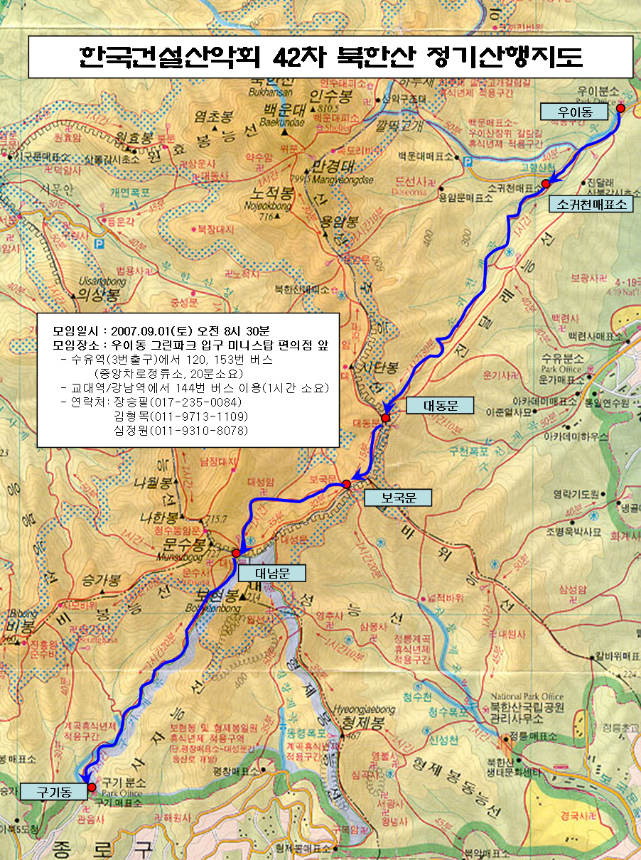 | 매우 덥고 변덕스러운 날씨가 한동안 계속되었습니다만, 이제 곧 본격적인 더위가 물러갈 듯 합니다. 주말의 산행을 통해 회원여러분들의 친목과 건강을 다지시셨으면 합니다. 1. 일시: 2007년 9월 1일 토요일 오전 08시 30분 2. 모임장소: 우이동 그린파크 들어가는 교량 앞 편의점(미니스탑) * 수유역(3번출구)에서 120, 153번 등 우이동행 버스 이용종점하차. (20~30분정도 소요) * 예전 170번 노선이 4월부터 153번 노선으로 통합되었습니다. * 강남역 또는 교대역에서 144번 지선버스를 타시면 한시간정도에 오실수 있습니다. 3. 등산코스: 우이동 - 소귀천계곡- 대동문 - 보국문 - 대남문 - 구기동 4. 예상산행시간: 4시간~ 4시간 30분 (휴식시간 포함) 5. 산행준비물: 등산복, 등산화(릿지화), 장갑, 스틱 등 산행장비, 행동식(과일, 떡, 초콜렛 등), 식수, 우의 6. 점심 식사 장소: 당일 결정하겠습니다. 7. 산행코스지도를 참조하세요. (내려받아보시면 더 선명하게 보실수 있습니다. 오른쪽 버튼 클릭후 다른이름으로 그림 저장 선택) ![]() ======================================== 서울대학교 지구환경시스템공학부 장승필 교수님 - 전화: 02-872-6137 - Fax: 02-872-6138 - E-mail: spchang@snu.ac.kr 총무보조: 심정원 - 전화: 02-880-8314 / 011-9310-8078 - Fax: 02-875-2148 - E-mail: sheyej1@snu.ac.kr ======================================== |