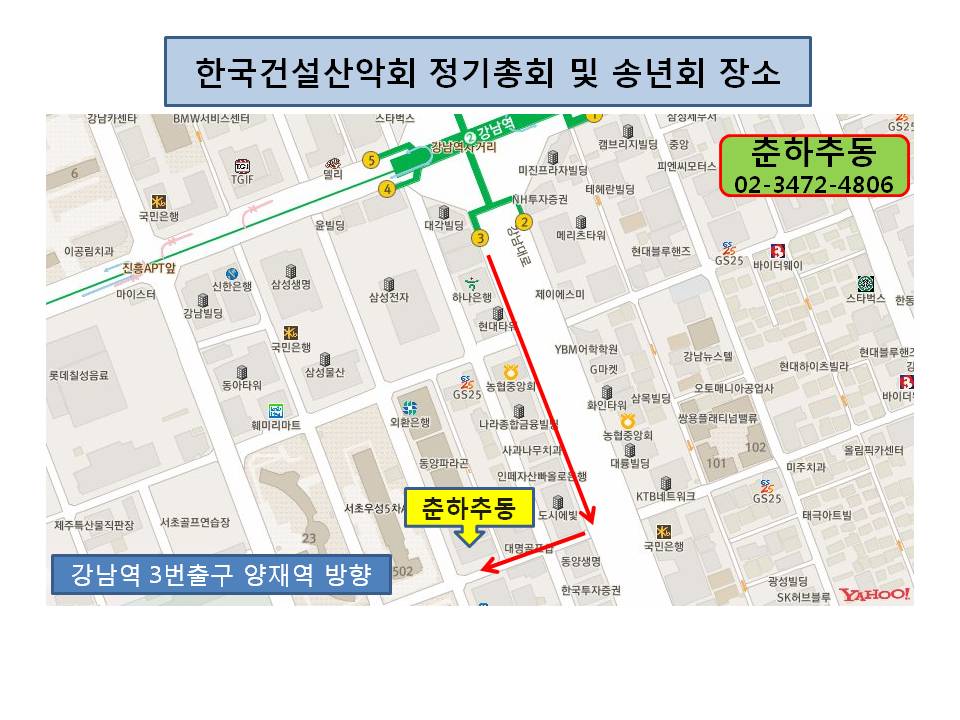 | 어느덧 날씨도 쌀쌀해지고 한해를 마무리할 시기가 다가오고 있습니다. 저희 산악회에서도 지나갈 2010년을 뒤돌아보고 새로 올 2011년을 계획하고자 정기총회 및 송년회를 가지고자 하오니 회원 여러분들께 많은 참석 부탁드립니다. 일시 : 2010년 12월 13일 월요일 오후 6시 30분 장소 : 강남역 3번출구 [춘하추동 3472-4806] **주차가능합니다.** 많은참석바랍니다. 연락처 김형목 : 011-9713-1109 이강철 : 010-3543-8662 심정원 : 011-9319-8078 ![]() |