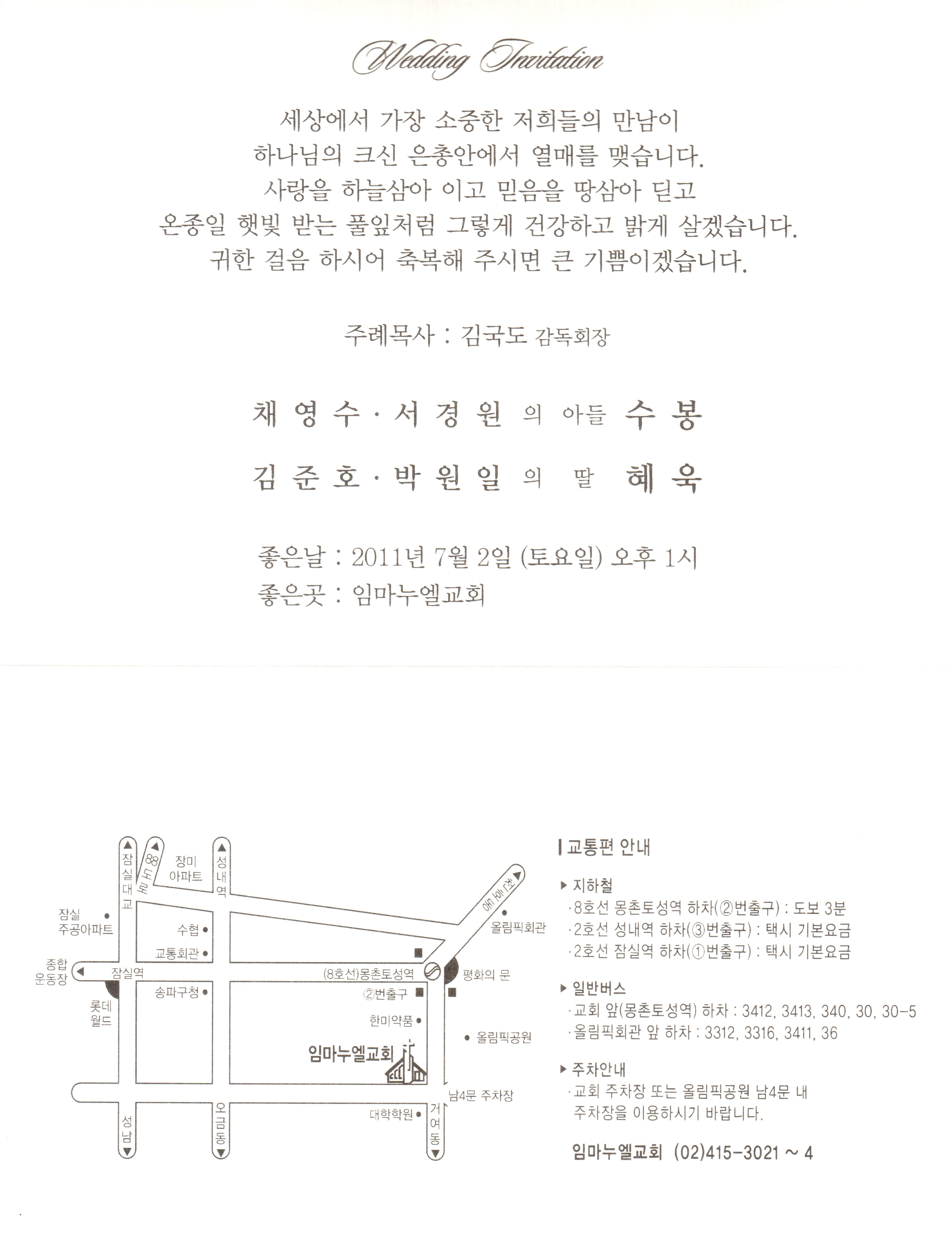 - 결혼식 장소: 임마누엘 교회 (8호선 몽촌토성 역 2번출구, 02-415-3021~4)