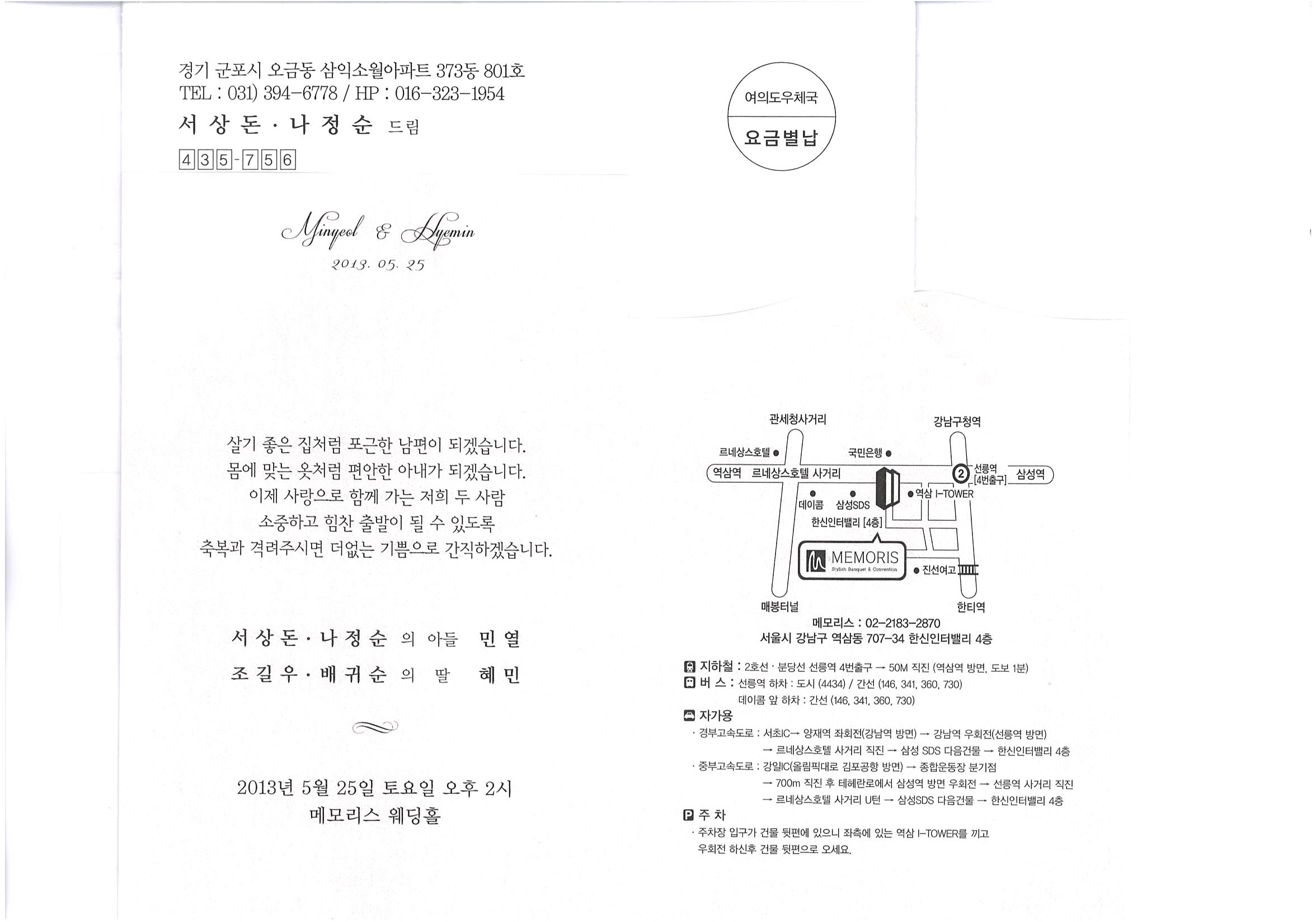 * 장소 : 메모리스 웨딩홀(강남구 역삼동 707-34. 한신인터벨리 4층)