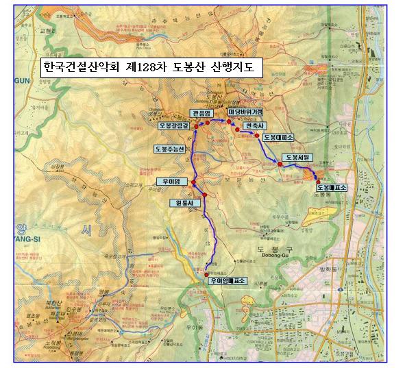 우이암매표소-우이암-도봉주능선-오봉갈림길-관음암-마당바위기점-도봉산대피소-도봉서원-도봉매표소