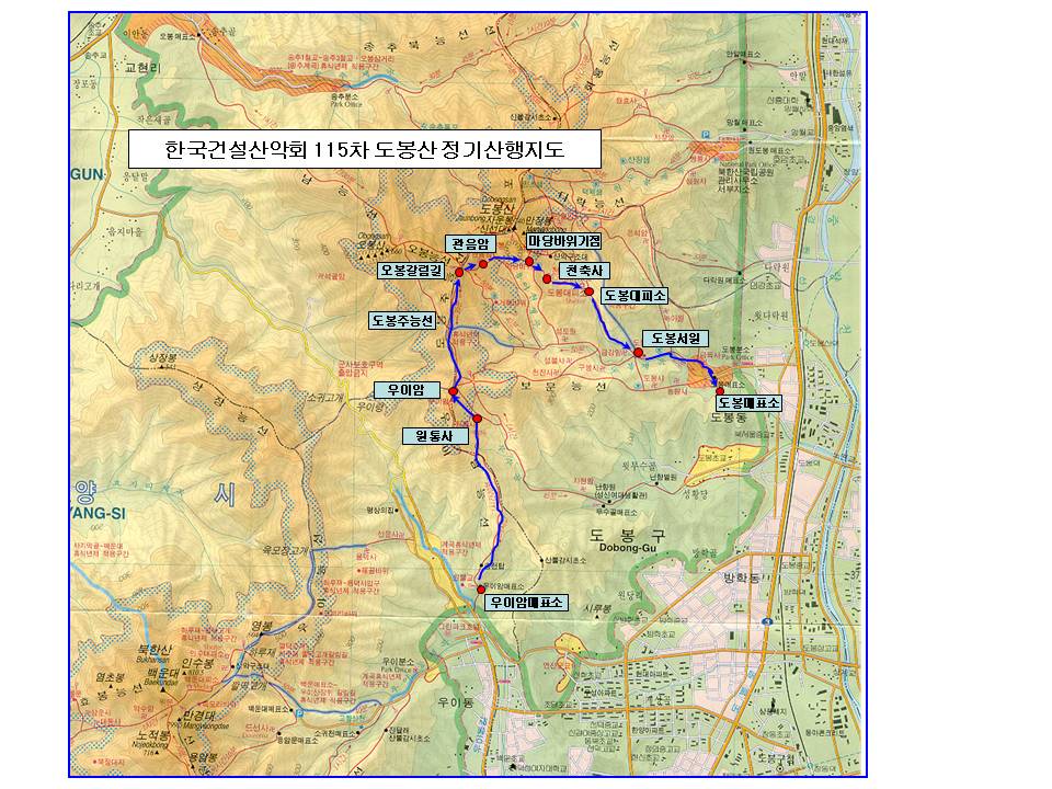 | 1. 일시: 2013년 12월 7일 토요일 오전 08시 30분 2. 모임장소: 우이동 그린파크 들어가는 교량 앞 편의점(미니스탑) * 수유역(3번출구)에서 120, 153번 등 우이동행 버스 이용종점하차. (20~30분정도 소요) * 예전 170번 노선이 4월부터 153번 노선으로 통합되었습니다. * 강남역 또는 교대역에서 144번 지선버스를 타시면 한시간정도에 오실수 있습니다. 3. 등산코스 우이암매표소-원통사-우이암-도봉주능선-오봉갈림길-관음암-마당바위기점-천축사-도봉산대피소-도봉서원-도봉매표소 4. 예상산행시간 : 4시간 (휴식시간 포함) 5. 산행준비물: 등산복, 등산화(릿지화), 장갑, 스틱 등 산행장비, 행동식(과일, 떡, 초콜렛 등), 식수 * 필요시 아이젠 지참 6. 점심 식사 장소: 당일 결정토록하겠습니다. 7. 문의 및 연락처 김형목(011-9713-1109) 윤종남(010-5288-9365) ![]() |