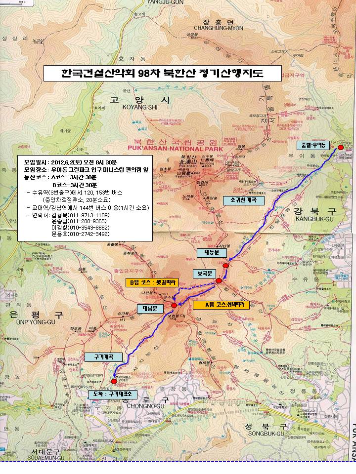 | 1. 일시: 2012년 6월 2일 토요일 오전 08시 30분 2. 모임장소: 우이동 그린파크 들어가는 교량 앞 편의점(미니스탑) * 수유역(3번출구)에서 120, 153번 등 우이동행 버스 이용종점하차. (20~30분정도 소요) * 예전 170번 노선이 4월부터 153번 노선으로 통합되었습니다. * 강남역 또는 교대역에서 144번 지선버스를 타시면 한시간정도에 오실수 있습니다. 3. 등산코스 A 코스 : 우이동 - 소귀천계곡 - 대동문 - 보국문 -(성벽 따라)- 대남문 - 구기계곡 - 구기매표소 B 코스 : 우이동 - 소귀천계곡 - 대동문 - 보국문 -(샛길 따라)- 대남문 - 구기계곡 - 구기매표소 4. 예상산행시간 A 코스 : 3시간 30분(휴식시간 포함) B 코스 : 3시간 30분(휴식시간 포함) 5. 산행준비물: 등산복, 등산화(릿지화), 장갑, 스틱 등 산행장비, 행동식(과일, 떡, 초콜렛 등), 식수 6. 점심 식사 장소: 구기동, 옛날민속집, 02-379-7129 7. 문의 및 연락처 총 무 김형목(011-9713-1109) 총무보조 윤종남(0 l l-2팔팔-93б5) 이강철(010-3543-8662) 문용호(010-2742-3492) ![]() |