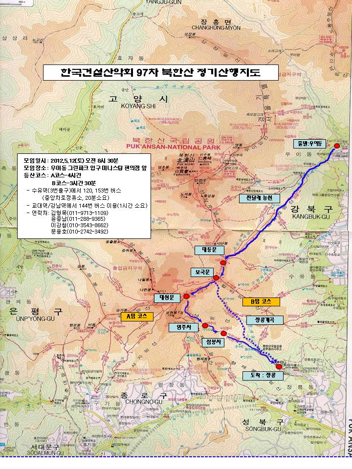 | 1. 일시: 2012년 5월 12일 토요일 오전 08시 30분 * 본회 특별회원이신 초은자매께서 산행에 함께할 예정입니다. 2. 모임장소: 우이동 그린파크 들어가는 교량 앞 편의점(미니스탑) * 수유역(3번출구)에서 120, 153번 등 우이동행 버스 이용종점하차. (20~30분정도 소요) * 예전 170번 노선이 4월부터 153번 노선으로 통합되었습니다. * 강남역 또는 교대역에서 144번 지선버스를 타시면 한시간정도에 오실수 있습니다. 3. 등산코스 A 코스 : 우이동 - 진달래능선 - 대동문 - 보국문 - 대성문 - 영추사 - 삼봉사 - 정릉 B 코스 : 우이동 - 진달래능선 - 대동문 - 보국문 - 정릉계곡 - 정릉 4. 예상산행시간 A 코스 : 4시간 (휴식시간 포함) B 코스 : 3시간 30분(휴식시간 포함) 5. 산행준비물: 등산복, 등산화(릿지화), 장갑, 스틱 등 산행장비, 행동식(과일, 떡, 초콜렛 등), 식수, 6. 점심 식사 장소: 정릉, 산장두부촌. 02-919-1599 7. 문의 및 연락처 총 무 김형목(011-9713-1109) 총무보조 윤종남(011-288-9365) 이강철(010-3543-8662) 문용호(010-2742-3492) ![]() |