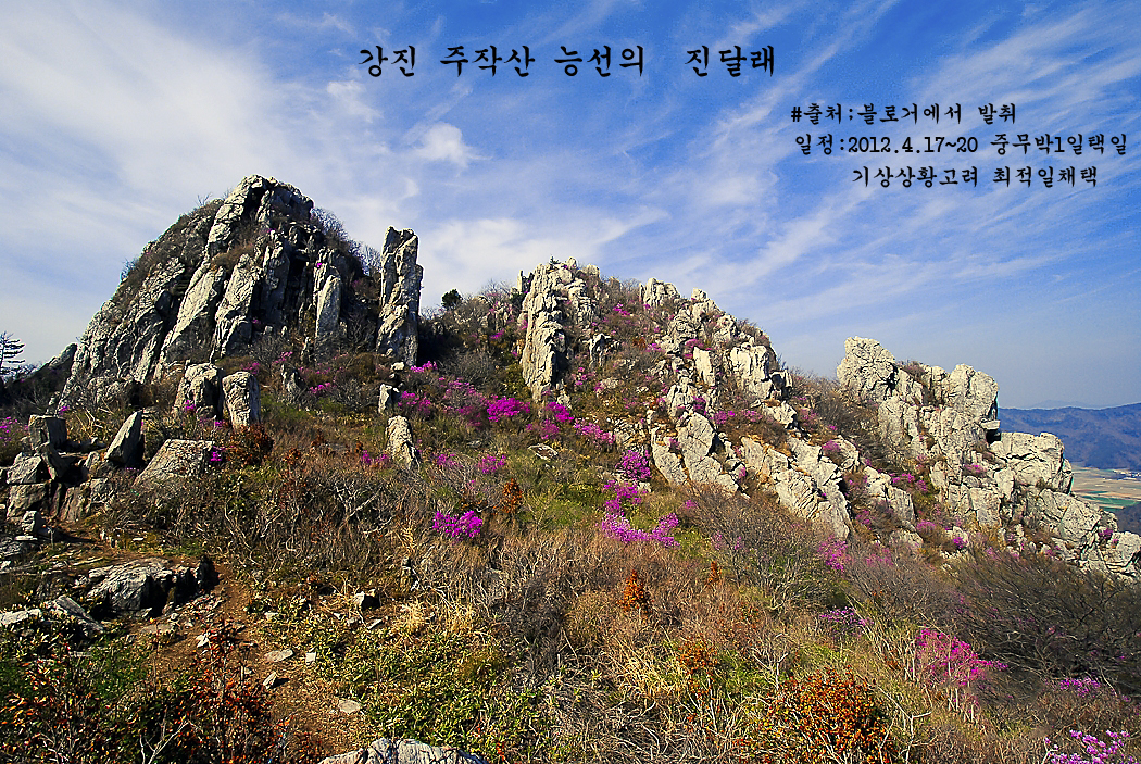 ![]() ![]() ![]() #회원님들 모두 안녕하시지요? 저는 개인적으로 4.17~20 사이에 전남 강진군에 있는 주작산 진달래를 사진에 담고자 갑니다. 저도 이곳은 모처 블로거에서 처음 보았을때 올해 꼭 갈려고 벼르고 있었지요. 흔히 진달래 군락지를 생각하기 쉬우나,주작 산처럼 암릉 곳곳에 진달래가 만개해 피어있는 광경 또한 멋있 는 풍광일것입니다. 저번 산행에서 이문제를 거론했으나,회장님과 대장님 의 의견이 주중행사등이 있어 참가가 전체적으로는 힘들고,개인적으로 시 간 나시는 분들은 다녀오는것도 괜찮을것이라고 말씀하셨읍니 다. 회원님 여러분! 진달래핀 금수강산을 같이동행 하면서 저멀리 남쪽의 다도해섬 과 주암릉 곳곳의 진달래의 풍경을 마음에 담아보는것은 어떨는 지요?! 희망하시는 분들은 저한테 연락 주시면 기상을 고려 최적의 날을 선택해 무박1일 로 진행 하겠읍니다. 참가비는 1/n 입니다. 참가 희망자는 금요일까지 연락주시면 고맙겠읍니다. 부부 동반도 좋을것 같구요. 양정호 사장님(암릉 전문산악인)의 인솔하에 안전산행 합니다. 참고로 주작산 높이는 470m 정도되나,남해의 공룡능선 이라는 명칭이 붙을정도로 풍광이 뛰어난 곳입니다. 참고로 모처의 사진을 발췌해 올림니다. 제가 약간의 수채화로 꾸며봤읍니다. 연락처;문준환 017-202-5660 두서없이 적었읍니다. 많은 양해 바람니다. 문준환 배상! |