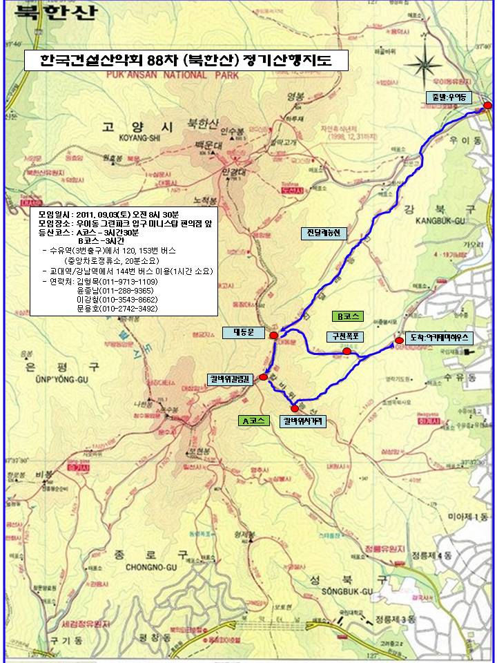 | 1. 일시: 2011년9월 3일 토요일 오전 08시 30분 2. 모임장소: 우이동 그린파크 들어가는 교량 앞 편의점(미니스탑) * 수유역(3번출구)에서 120, 153번 등 우이동행 버스 이용종점하차. (20~30분정도 소요) * 예전 170번 노선이 4월부터 153번 노선으로 통합되었습니다. * 강남역 또는 교대역에서 144번 지선버스를 타시면 한시간정도에 오실수 있습니다. 3. 등산코스 A 코스 : 우이동 - 진달래능선 - 대동문 - 칼바위갈림길 - 칼바위사거리 - 아카데미하우스 B 코스 : 우이동 - 진달래능선 - 대동문- 구천폭포 - 아카데미하우스 4. 예상산행시간 A 코스 : 3시간 30분(휴식시간 포함) B 코스 : 3시간(휴식시간 포함) ![]() |