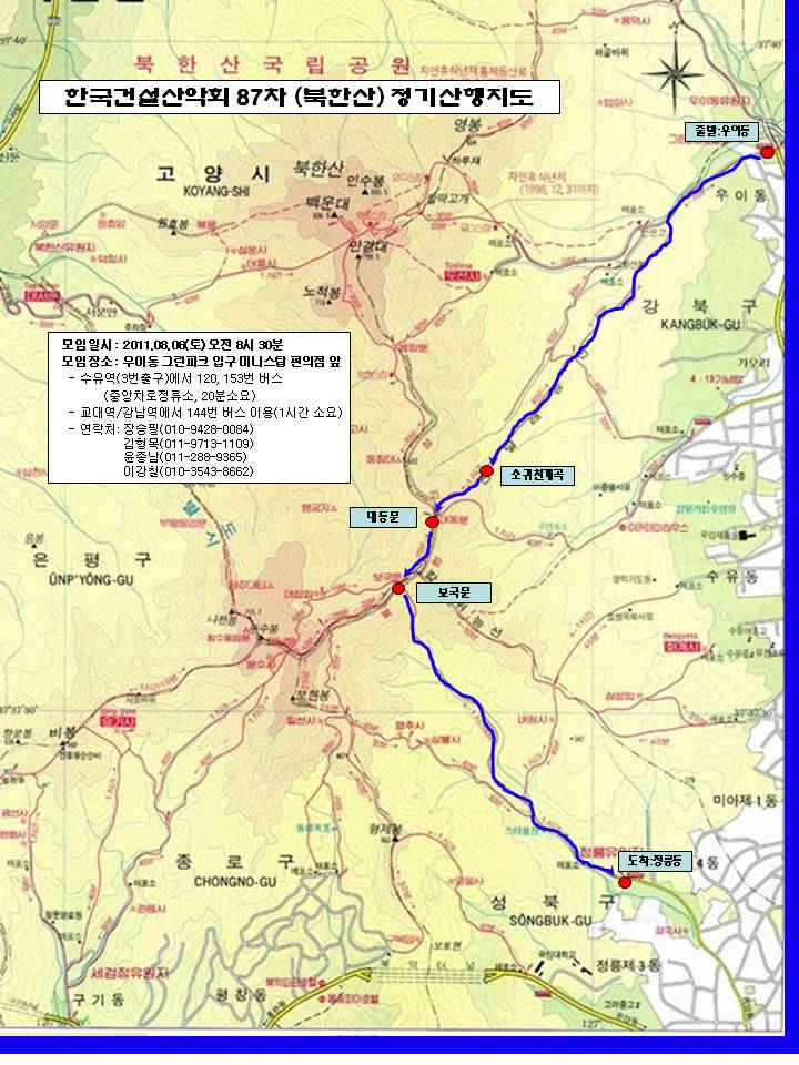 | 1. 일시: 2011년 8월6일 토요일 오전 08시 30분 2. 모임장소: 우이동 그린파크 들어가는 교량 앞 편의점(미니스탑) * 수유역(3번출구)에서 120, 153번 등 우이동행 버스 이용종점하차. (20~30분정도 소요) * 예전 170번 노선이 4월부터 153번 노선으로 통합되었습니다. * 강남역 또는 교대역에서 144번 지선버스를 타시면 한시간정도에 오실수 있습니다. 3. 등산코스 : 우이동 - 소귀천계곡 - 대동문 - 보국문 - 정릉 4. 예상산행시간 : 3시간반 5. 산행준비물: 등산복, 등산화(릿지화), 장갑, 스틱 등 산행장비, 행동식(과일, 떡, 초콜렛 등), 식수, 6. 점심 식사 장소: 당일 결정토록하겠습니다. 7. 문의 및 연락처 총 무 김형목(011-9713-1109) 총무보조 윤종남(011-288-9365) 이강철(010-3543-8662) 문용호(010-2742-3492) ![]() |