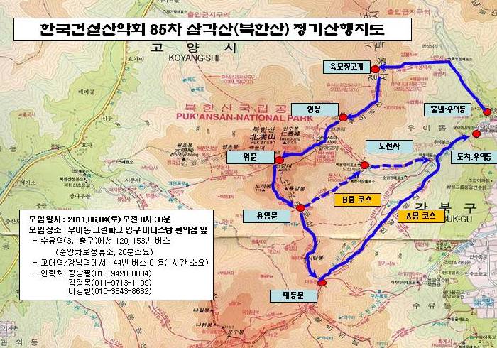 | 1. 일시: 2011년 6월 4일 토요일 오전 08시 30분 2. 모임장소: 우이동 그린파크 들어가는 교량 앞 편의점(미니스탑) * 수유역(3번출구)에서 120, 153번 등 우이동행 버스 이용종점하차. (20~30분정도 소요) * 예전 170번 노선이 4월부터 153번 노선으로 통합되었습니다. * 강남역 또는 교대역에서 144번 지선버스를 타시면 한시간정도에 오실수 있습니다. 3. 등산코스 A 코스 : 우이동 - 육모정고개 - 영봉 - 위문 - 용암문 - 대동문 - 우이동 B 코스 : 우이동 - 육모정고개 - 영봉 - 위문 - 용암문 - 도선사 - 우이동 4. 예상산행시간: 4시간 ~ 4시간 30분 (휴식시간 포함) 5. 산행준비물: 등산복, 등산화(릿지화), 장갑, 스틱 등 산행장비, 행동식(과일, 떡, 초콜렛 등), 식수, 6. 점심 식사 장소: 당일 결정토록하겠습니다. 7. 문의 및 연락처 총무 김형목(011-9713-1109) 총무보조 이강철(010-3543-8662) 8. 산행지도를 참고 하십시오(오른쪽 클릭하여 저장하여서 보시면 더 크게 보실수 있습니다.) ![]() |