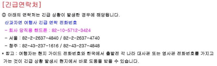 ![]() ◈ 참고사항안내 [유의사항] ① 예약시 여권상에 기재된 정확한 영문이름과 주민번호를 알려주셔야 합니다. ② 일정상의 표기된 일정과 호텔은 부득이한 경우 현지 사정에 따라 변동 될 수 있습니다. ③ 단체여행을 목적으로 한 패키지 상품은 일정 내 개별 활동은 불가능하며 개별활동을 원할 시에는 개별여행 상품으로 예약 문의 부탁드립니다. ④ 각 나라별 입국시 담배 및 주류는 반입 허용 범위를 확인하시기 바랍니다. ⑤ 각 나라에 따라 호텔에 세면도구(치약,칫솔 등)를 구비하지 않는 경우도 있습니다. ⑥ 호텔은 2인 1실 기준입니다. [공항이용시 주의사항] 2007년 3월을 기하여 국제선을 이용하는 승객을 대상으로 액체류에 대한 검색이 강화되었습니다.용기당 100ml를 초과하는 화장품, 치약류, 헤어젤 등 기타 액체류 물품은 기내반입이 제한되며 총 1리터(1인당)가 넘는 경우 공항압수 등의 조치가 있을 수 있습니다. (단, 탁송수하물은 제한사항 없음) 또한 이로 인하여 출국수속시간이 지연될 수 있사오니 미팅시간을 엄수하여 주시기 바랍니다. 예약(예약금 입금)후 여행을 취소할 경우 국외여행표준약관 제 15조의 소비자피해보상규정에 따라 아래의 비율로 취소료를 부과함을 양지하여 주시기 바랍니다. [예약금 규정](정기노선) - 예약후 3일이내(~3일)에 1인당여행경비의100,000원 예약금을 입금 하셔야 합니다. 예약금을 입금하지 않으실 경우 예약이 확정되지 않습니다.여행자의 취소요청시시 하기의 경우에 해당시 여행약관에 의거 취소료가 부과됩니다. - 여행출발 30일전까지 요청시 : 여행계약금 환급 - 여행출발 29일~20일전까지 요청시 : 여행경비의 10% 취소료 부과 - 여행출발 19일~10일전까지 요청시 : 여행경비의 15% 취소료 부과 - 여행출발 9~8일전까지 요청시 : 여행경비의 20% 취소료 부과 - 여행출발 7~1일전까지 요청시 : 여행경비의 30% 취소료 부과 - 여행출발 당일 통보 : 여행경비의 50% 취소료 부과 * 근무일(공휴일 및 토,일요일 제외) 및 근무시간(18시30분까지) 내에 취소요청에 한함. [최저출발인원 미 충족시 계약해제] 여행약관 제9조(최저행사인원 미 충족시 계약해제 또는 타여행사 와 행사 진행)에 의거 ① 당사는 최저행사인원이 충족되지 아니하여 여행계약을 해제하는 경우 여행출발 7일전까지 여행자에게 통지하여야 한다. ② 당사는 여행참가자 수 미달로 전항의 기일내 통지를 하지 아니하고 계약을 해제하는 경우 이미 지급 받은 계약금 환급 외에 다음 각 목의 1의 금액을 여행자에게 배상하여야 한다. - 여행개시 7일전까지 통보시 : 계약금 환급 - 여행개시 6~1 일전까지 통보시 : 여행요금의 20% 배상 - 여행당일 통보시 : 여행요금의 50% 배상 ![]() ▶산과 자연 여행사 홈페이지에 들어 가셔서 확인 바랍니다. [여권비자정보] 1. 여권 유효기간은 출발일 기준으로 6개월 이상 남아 있어야 합니다. 2. 단수여권의 경우 미사용 여권이어야 합니다. 3. 한국인은 단체 비자 또는 개인 VISA을 받아야 입국이 가능합니다. 4. 외국인(시민권자)은 VISA 필요 유무를 해당국가 대사관에 사전확인 바랍니다 [중국단체비자 유의사항] 1. 중국은 출입국시 비자가 필요한 국가이며, [개인비자/단체비자] 중 택1 가능합니다. (외국/이중국적자께서는 본인의 국적지 대사관으로 문의하셔야 합니다) 2. 단체비자는 5인이상 신청이 가능하며 타인과 함께 A4용지에 낱장의 형태로 중국정부로부터 발급되며 개인정보(영문명,성별,생년월일,여권번호,국적)가 출입국관리국으로 공유되어 제출되며, 단체비자 사본이 출입국시 사용되는점 인지하여 주시기 바랍니다. 3. 단체비자의 경우 여권사본이 중국대사관에 제출되어야 발급가능하며, 출국당일 제출하신 여권사본과 동일한 여권을 지참하여야 합니다. 4. [필독] 단체비자 보관은 단체비자 1번 고객님께서 보관(훼손이 발생하면 안됩니다) 하셔야 하며, 입국시 단체비자 1번 고객님이 원본 2장을 중국 입국 심사시 제출하고, 단체비자 마지막 고객님께서 원본 1부을 받아서, 단체비자 1번 고객님에게 드려 보관, 중국에서 출국시 단체비자 원본 1부를 출국심사시 제출하여야 합니다, 단체 비자를 분실시, 단체비자 명단에 있는 모든분이 중국에서 출국할 수 없습니다. 중국 현지에서 체류하면서 단체비자 재발급후 중국에서 출국을 할 수 있습니다. [유류할증 및 환률] ![]() ![]() |