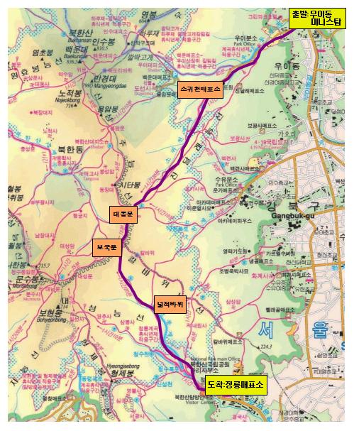 우이령길입구 → 소귀천매표소 → 소귀천계곡 → 대동문 → 보국문 → 넓적바위 → 정릉계곡 → 정릉매표소