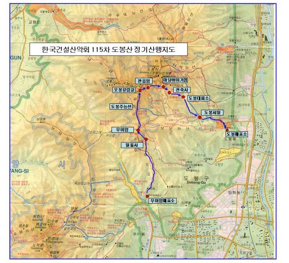 우이령길입구 → 원통사 → 우이암 → 도봉주능선 → 관음암 → 마당바위 → 천축사 → 도봉대피소 → 도봉서원 → 도봉탐방지원센터