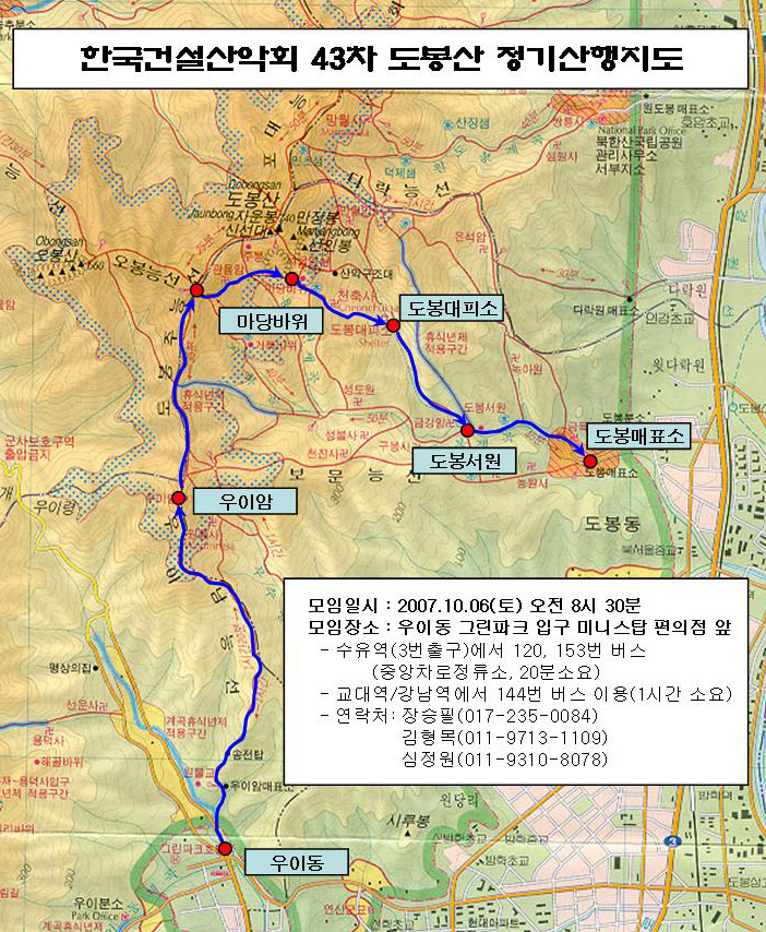 한동안 무더운 날씨가 계속되더니 이제는 아침저녁을 제법 쌀쌀한 기운을 느낄 수 있는 계절이 되었습니다. 추석연휴 알차게 보내시고 10월 산행에도 많은 참여 부탁드립니다. 1. 일시: 2007년 10월 6일 토요일 오전 08시 30분 2. 모임장소: 우이동 그린파크 들어가는 교량 앞 편의점(미니스탑) * 수유역(3번출구)에서 120, 153번 등 우이동행 버스 이용종점하차. (20~30분정도 소요) * 예전 170번 노선이 4월부터 153번 노선으로 통합되었습니다. * 강남역 또는 교대역에서 144번 지선버스를 타시면 한시간정도에 오실수 있습니다. 3. 등산코스: 우이동 - 우이암 - 관음암 - 마당바위 - 도봉대피소 - 도봉서원 - 도봉매표소 4. 예상산행시간: 4시간~ 4시간 30분 (휴식시간 포함) 5. 산행준비물: 등산복, 등산화(릿지화), 장갑, 스틱 등 산행장비, 행동식(과일, 떡, 초콜렛 등), 식수, 우의 6. 점심 식사 장소: 당일 결정하겠습니다. 7. 산행코스지도를 참조하세요. ![]() ======================================== 서울대학교 지구환경시스템공학부 장승필 교수님 - 전화: 02-872-6137 - Fax: 02-872-6138 - E-mail: spchang@snu.ac.kr 총무보조: 심정원 - 전화: 02-880-8314 / 011-9310-8078 - Fax: 02-875-2148 - E-mail: sheyej1@snu.ac.kr ======================================== |