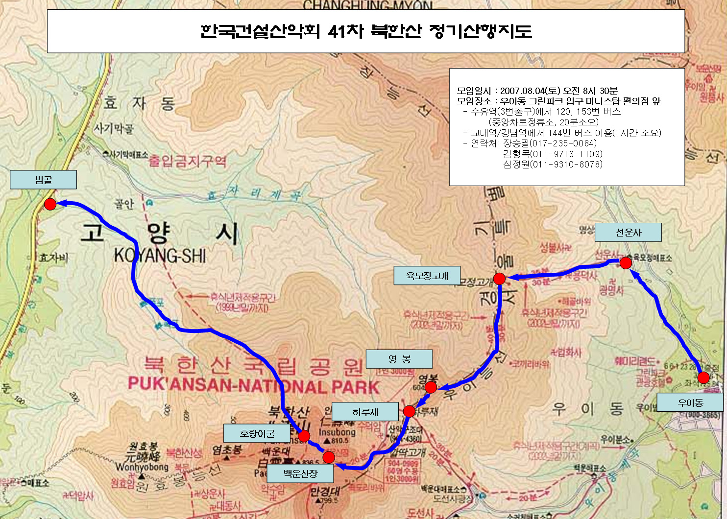 | 이제 장마가 물러나고 본격적인 여름이 시작되었습니다. 후텁지근한 날씨에 건강 조심하시고, 회원 여러분들과의 산행을 통해 친목을 다지셨으면 합니다. 1. 일시: 2007년 8월 4일 토요일 08시 30분 2. 모임장소: 우이동 그린파크 들어가는 교량 앞 편의점(미니스탑) * 수유역(3번출구)에서 120, 153번 등 우이동행 버스 이용종점하차. (20~30분정도 소요) * 예전 170번 노선이 4월부터 153번 노선으로 통합되었습니다. * 강남역 또는 교대역에서 144번 지선버스를 타시면 한시간정도에 오실수 있습니다. 3. 등산코스: 우이동 - 육모정고개 - 영봉 - 하루재 - 백운산장 - 호랑이굴 - 밤골 4. 예상산행시간: 4시간 (휴식시간 포함) 5. 산행준비물: 등산복, 등산화(릿지화), 장갑, 스틱 등 산행장비, 행동식(과일, 떡, 초콜렛 등), 식수, 우의 6. 점심 식사 장소: 당일 결정하겠습니다. 7. 산행코스지도를 참조하세요. (내려받아보시면 더 선명하게 보실수 있습니다. 오른쪽 버튼 클릭후 다른이름으로 그림 저장 선택) ![]() ======================================== 서울대학교 지구환경시스템공학부 장승필 교수님 - 전화: 02-872-6137 - Fax: 02-872-6138 - E-mail: spchang@snu.ac.kr 총무보조: 심정원 - 전화: 02-880-8314 / 011-9310-8078 - Fax: 02-875-2148 - E-mail: sheyej1@snu.ac.kr ======================================== |