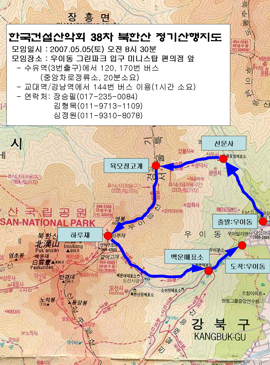 | 제38차 북한산 정기산행 이제 낮에는 따듯함을 넘어 제법 덥다고 느낄만한 계절이 되고 날씨도 화창하여 나들이하고픈 마음이 저절로 들게 되는 것 같습니다. 가정의 달 5월 산행은 마침 5월 5일 어린이날 있게 되었습니다. 부부단위, 가족단위로 산행에 참여해 주셨으면 하는 마음에서 짧고 쉬운 코스로 계획을 하였사오니 많이 참여해 주시면 좋겠습니다. 1. 일시: 2007년 5월 5일 토요일 08시 30분 2. 모임장소: 우이동 그린파크 들어가는 교량 앞 편의점(미니스탑) * 수유역(3번출구)에서 120, 170번등 우이동행 버스 이용종점하차. (20~30분정도 소요) * 강남역 또는 교대역에서 144번 지선버스를 타시면 한시간정도에 오실수 있습니다. 3. 등산코스: 우이동 - 선운사 - 육모정고개 - 하루재 - 백운매표소 - 우이동 4. 예상산행시간: 2시간 30분 (휴식시간 포함) 5. 산행준비물: 등산복, 등산화(릿지화), 장갑, 스틱 등 산행장비, 행동식(과일, 떡, 초콜렛 등), 식수, 오버자켓 6. 점심 식사 : 미정 7. 산행코스지도를 참조하세요.(이미지를 내려받아 보시면 더 선명하게 보실수 있습니다.) ![]() |
