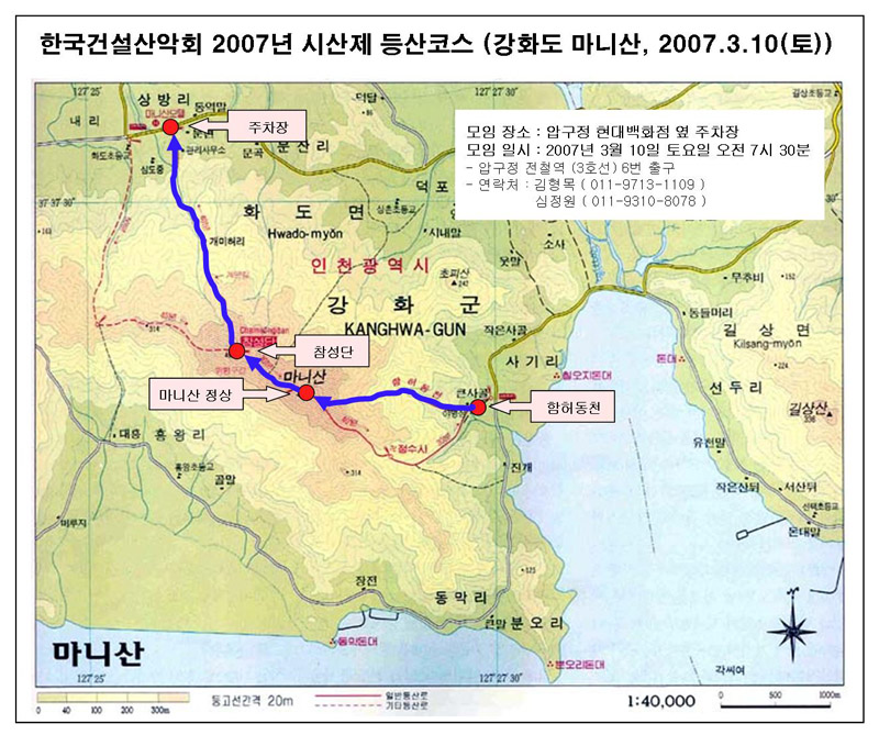 | 안녕하십니까? 3월 7일 현지 답사결과 시산제 등산코스를 변경하는 것이 좋을 것이라 결정하여 이를 공지해 드립니다. 세부일정은 달라졌지만, 모임 시각과 모임 장소, 서울 출발시각과 도착시각에는 변동이 없음을 알려드립니다. 한국건설산악회 2007년 시산제 계획(3월 7일 수정) 1. 일시 : 2007. 3. 10 (토) 2. 장소: 강화도 마니산(469m) 3. 모이는 시간 : 오전 7시 30분 모이는 장소 : 압구정동 현대백화점 옆 주차장 (지하철 3호선 압구정역 6번 출구) 4. 변경된 일정 08:00 : 서울 출발 09:30 : 함허동천 도착 09:30 ~ 12:30 : 마니산 등산 12:30 : 마니산 국민관광단지 도착 12:30 ~ 13:00 : 시산제 13:00 ~ 15:30 : 점심식사 15:30 : 마니산 출발 18:00 : 서울 도착 5. 변경된 산행코스 ![]() |