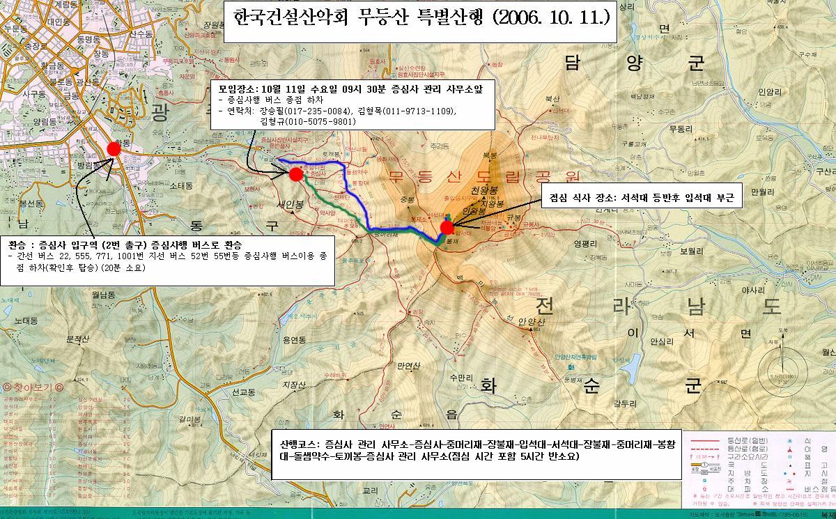 | 무등산 (해발 1187m) 특별산행 (주관: 대한토목학회, 한국 건설 산악회) 2006년 대한토목학회가 광주 광역시에서 열립니다. 학회와 더불어 참석하시는 한건산 회원님들과 광주의 주산인 무등산 특별산행을 실시하려고 합니다. 단풍과 억새로 알려진 광주 무등산에서 가을의 정취를 맘껏 느끼며 자연과 좀 더 호흡할 수 있는 시간을 갖는다면, 이번 학회가 좀더 뜻 깊지 않을까 사려 됩니다.회원님들의 많은 참석 부탁 드립니다. 자세한 내용은 아래와 같습니다. 1. 일시: 2006년 10월 11일 수요일 9시 30분 2. 모임장소: 광주 광역시 증심사 관리 사무소 3. 산행코스: 증심사 관리 사무소 – 증심사(25분) – 중머리재(45분) – 장불재(45분) – 임석대(15분) – 서석대(10분) – 장불재(15분) - 중머리재(30분) – 봉황대(25분) – 돌샘약수(15분) – 토끼봉 – 증심사 관리 사무소(40분)(점심시간 포함 5시간 반 소요예정) 산행 코스는 아래 지도를 참고하여 주십시요. * 점심 식사 장소 : 서석대 등반후 입석대 부근에서 식사(산행코스참고) * 점심 식사는 도식락을 준비 하겠습니다. 4. 예상산행시간: 총 5시간 반정도 소요예상(휴식 및 점심 시간 포함) 5. 산행준비물: 등산복, 등산화(릿지화), 장갑, 스틱 등 산행장비, 행동식(과일, 떡, 초콜렛 등), 식수, 오버자켓, 우의 6. 산행신청 담당자 : 김형규 (서울대학교 교량공학 연구실) 전화: 02)880-7346 H.P: 010)5075-9801 e-mail: mickykimhg@nate.com * 신청시 반드시 휴대폰 번호, 예정 교통편과 도착시간을 알려주시기 바랍니다. 7. 산행 후 저녁 모임이 있을 예정입니다. 시간은 당일 오후 7시이며 장소는 추후 공지 하겠습니다. 8. 산행코스지도를 참조하시기 바랍니다. ![]() 참고 ![]() -증심사 입구역 하차후 2번 출구로 나오셔서 간선 버스 27번 555번 771번 1001번, 지선 버스 52번 15번으로 환승 하신 후 증심사 정거장에서 하차 하시면 되겠습니다.(약 20분 소요 예상) ![]() -증심사 입구역 에서 택시를 이용 증심사 까지 오실 경우 약 5분 정도 소요 되는 것으로 판단 됩니다. |