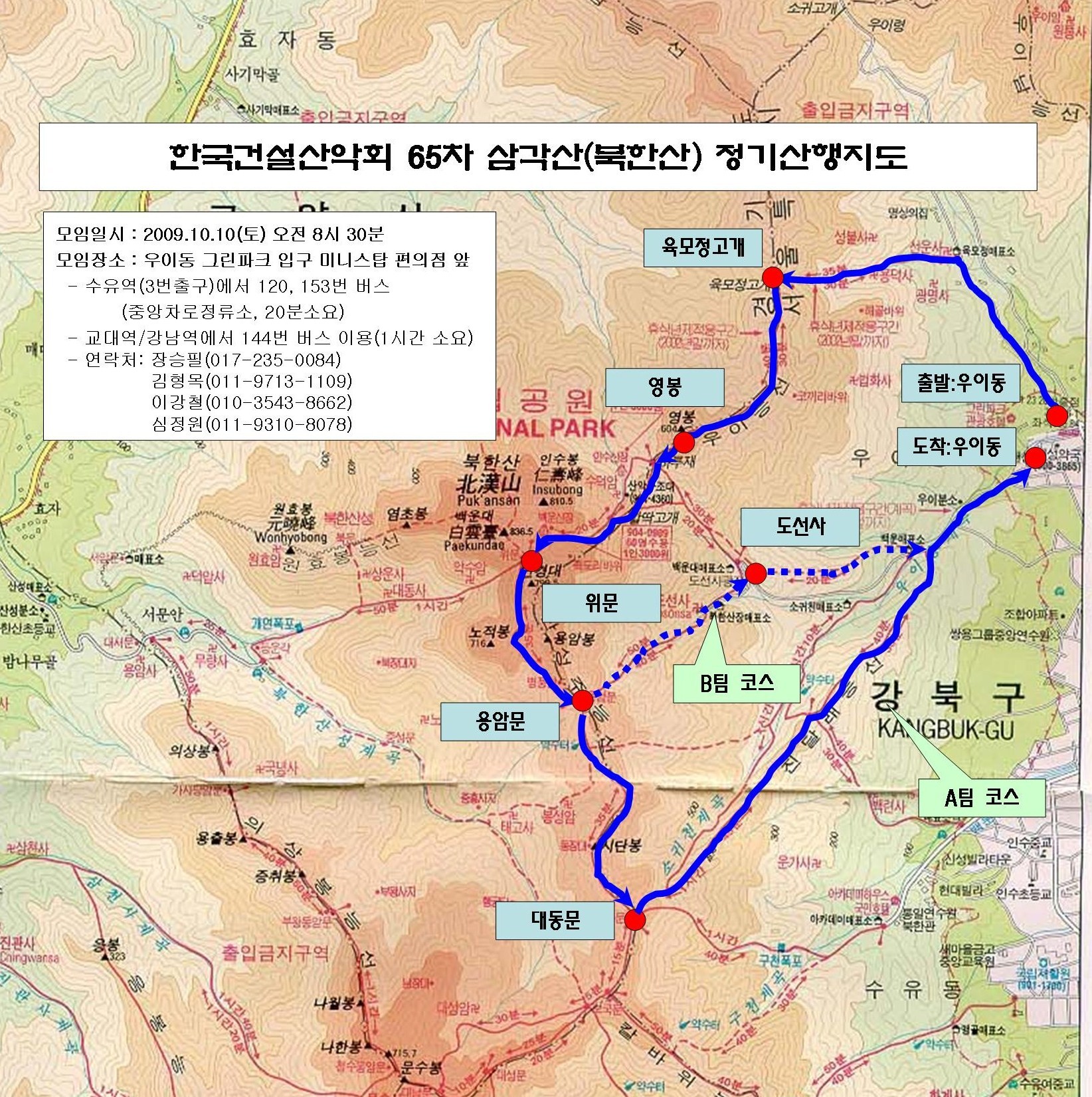 | 즐거운 한가위가 지나고 더불어 산행하기에 더없이 좋은 계절이 돌아왔습니다. 모든회원님들이 건강시길 기원합니다 1. 일시: 2009년 10월 10일 토요일 오전 08시 30분 2. 모임장소: 우이동 그린파크 들어가는 교량 앞 편의점(미니스탑) * 수유역(3번출구)에서 120, 153번 등 우이동행 버스 이용종점하차. (20~30분정도 소요) * 예전 170번 노선이 4월부터 153번 노선으로 통합되었습니다. * 강남역 또는 교대역에서 144번 지선버스를 타시면 한시간정도에 오실수 있습니다. 3. 등산코스 A코스 : 우이동-육모정고개-영봉-위문-용암문-대동문-우이동 B코스 : 우이동-육모정고개-영봉-위문-용암문-도선사-우이동 4. 예상산행시간: 4시간 ~ 4시간 30분 (휴식시간 포함) 5. 산행준비물: 등산복, 등산화(릿지화), 장갑, 스틱 등 산행장비, 행동식(과일, 떡, 초콜렛 등), 식수, 우의 6. 점심 식사 장소: 당일 결정하겠습니다. 7. 문의 및 연락처 장승필(017-235-0084) 김형목(011-9713-1109) 이강철(010-3543-8662) 심정원(011-9310-8078) 8. 산행지도를 참고 하십시오(오른쪽 클릭하여 저장하여서 보시면 더 크게 보실수 있습니다.) ![]() |