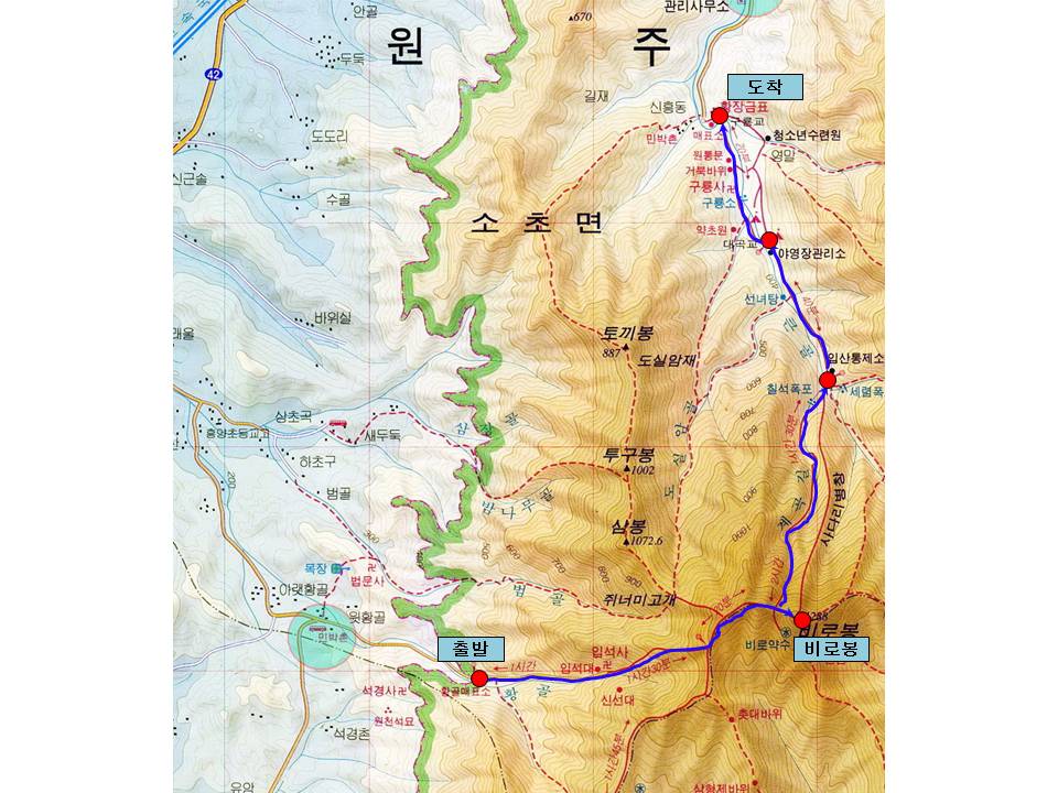 | 1. 산행정보 ○ 산행지 : 치악산 ○ 일 시 : 2009년 10월 21일(토목학회 일정 첫날, 당일코스) ○ 모임 시간 및 장소 : - 서울에서 당일 아침에 출발하실 참가자 분들: 시간: 오전 6시 45분 장소: 압구정동 현대백화점 옆 주차장 집합 - 치악산으로 바로 오실분들: 시간: 오전 9시 30분 장소: 치악산 황골 주차장 ○ 세부일정 : 07:00 서울 압구정동 버스 출발 09:30 원주시 치악산 황골 주차장 도착 09:40~16:30 산행 - 코스:황골매표소-입석대-치악산비로봉-계곡길-구룡사-주차장 - 점심식사: 산행 중 도시락 14:30~17:00 사우나 장소로 이동 17:00~17:40 사우나 17:40~18:00 토목학회 행사장소 이동 18:00~18:50 토목학회 행사참석 18:50~19:10 저녁식사 장소로 이동 19:10~20:40 저녁식사 20:40~22:30 서울도착후 해산 2. 개인별 산행준비물 - 등산화, 배낭, 장갑, 스틱, 방풍자켓 등 기본 산행 복장. - 식수(1병은 제공), 간식 및 비상식: 초콜렛, 과자, 떡 등. - 우천시 우의, 배낭 커버. 3. 특기사항 - 아침 김밥 1줄, 도시락 및 식수 1병 제공 4. 참가비 : 20,000원 5. 사전참가신청안내 10월 14일까지 이메일(ojam@daelim.co.kr) 및 전화(010-3543-8662)접수 참가비는 당일 납부 ※ 이메일 접수를 하신 분들은 확인 회신을 드리겠습니다. 회신을 받지 못한 분들께서는 전화확인 부탁드립니다. 6. 문의 및 연락처. 한국건설산악회 이강철(010-3543-8662, ojam@daelim.co.kr) 7. 등산코스 지도 ![]() |