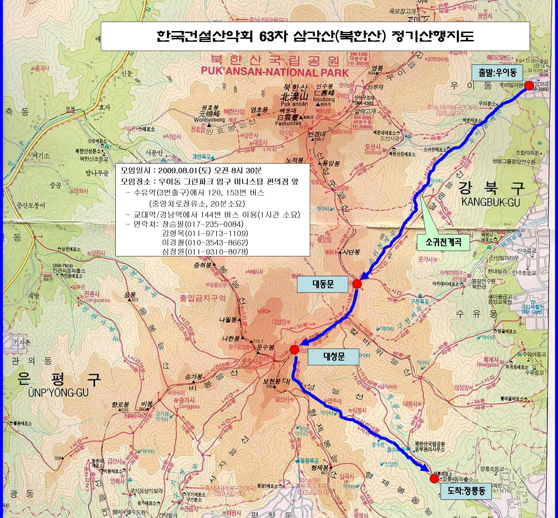 | 지루했던 장마가 끝나고 본격적인 무더위가 시작되고 있습니다. 모든회원님들이 건강시길 기원합니다 1. 일시: 2009년 8월 1일 토요일 오전 08시 30분 2. 모임장소: 우이동 그린파크 들어가는 교량 앞 편의점(미니스탑) * 수유역(3번출구)에서 120, 153번 등 우이동행 버스 이용종점하차. (20~30분정도 소요) * 예전 170번 노선이 4월부터 153번 노선으로 통합되었습니다. * 강남역 또는 교대역에서 144번 지선버스를 타시면 한시간정도에 오실수 있습니다. 3. 등산코스: 우이동 - 소귀천계곡 - 대서문 - 정릉동 4. 예상산행시간: 3시간 ~ 3시간 30분 (휴식시간 포함) 5. 산행준비물: 등산복, 등산화(릿지화), 장갑, 스틱 등 산행장비, 행동식(과일, 떡, 초콜렛 등), 식수, 우의 6. 점심 식사 장소: 당일 결정하겠습니다. 7. 문의 및 연락처 총무보조 이강철(010-3543-8662) 8. 산행지도를 참고 하십시오(오른쪽 클릭하여 저장하여서 보시면 더 크게 보실수 있습니다.) ![]() |
